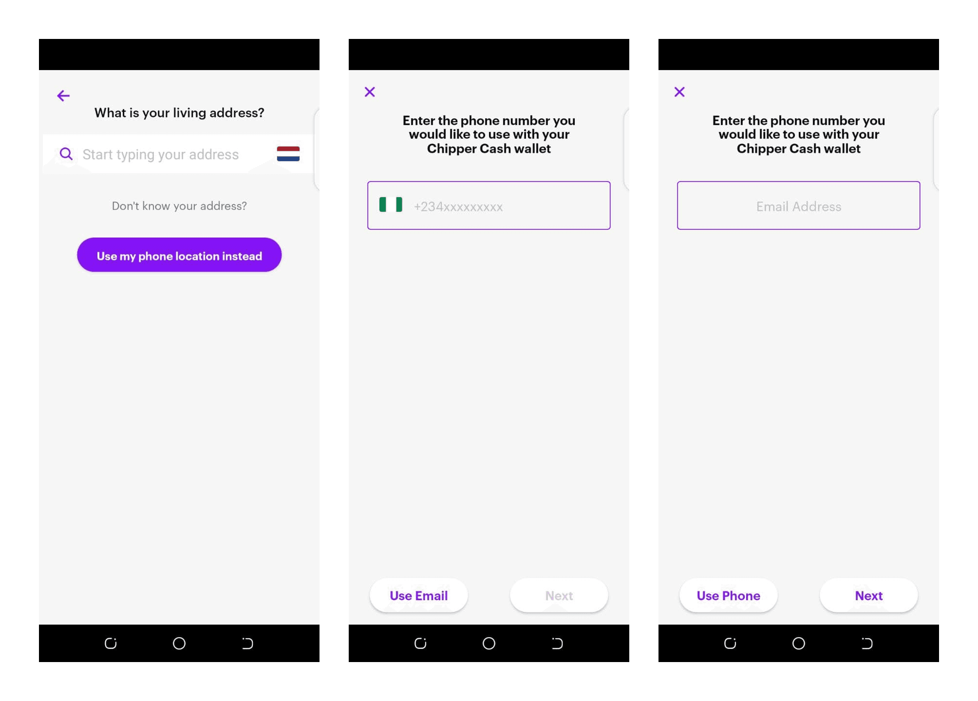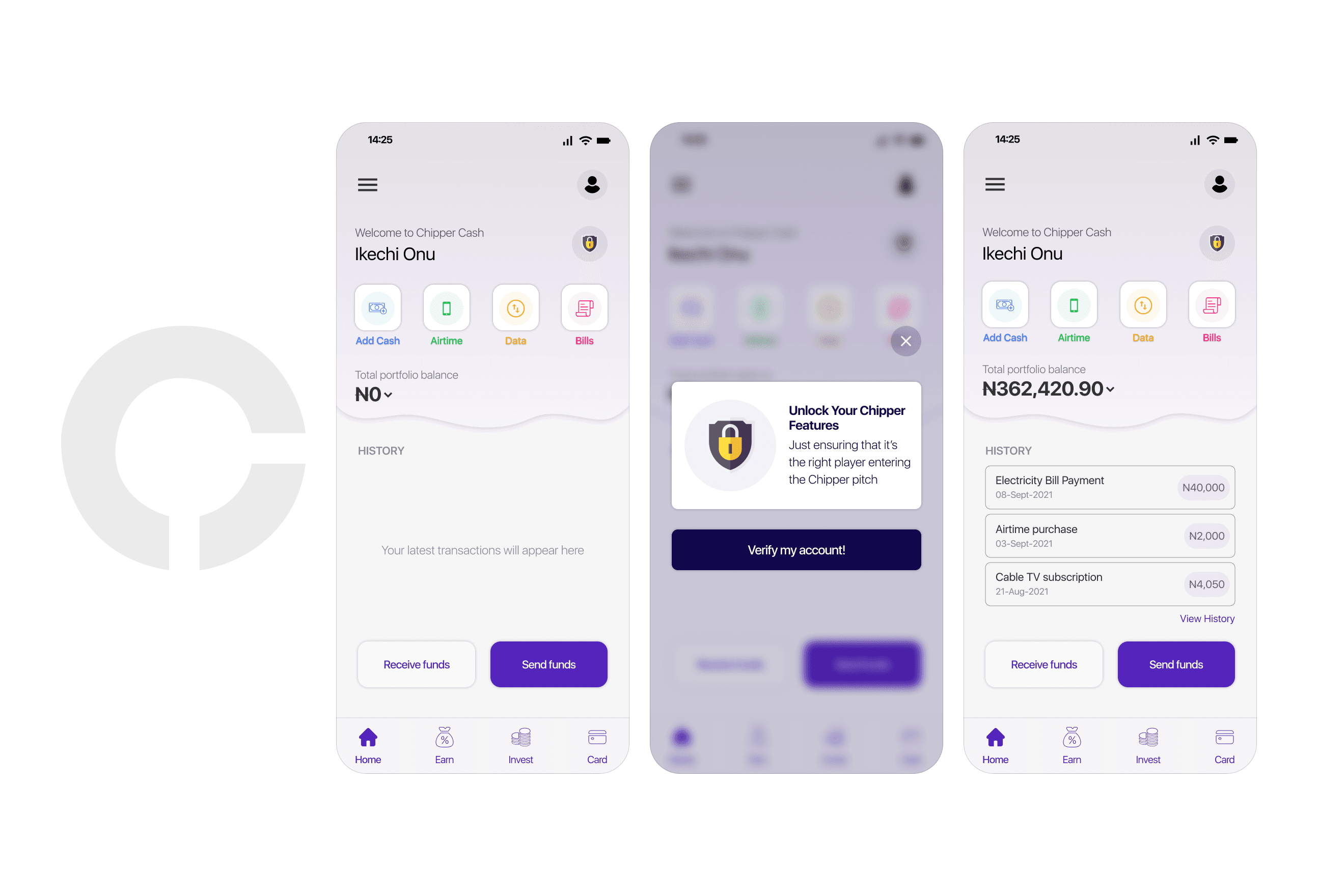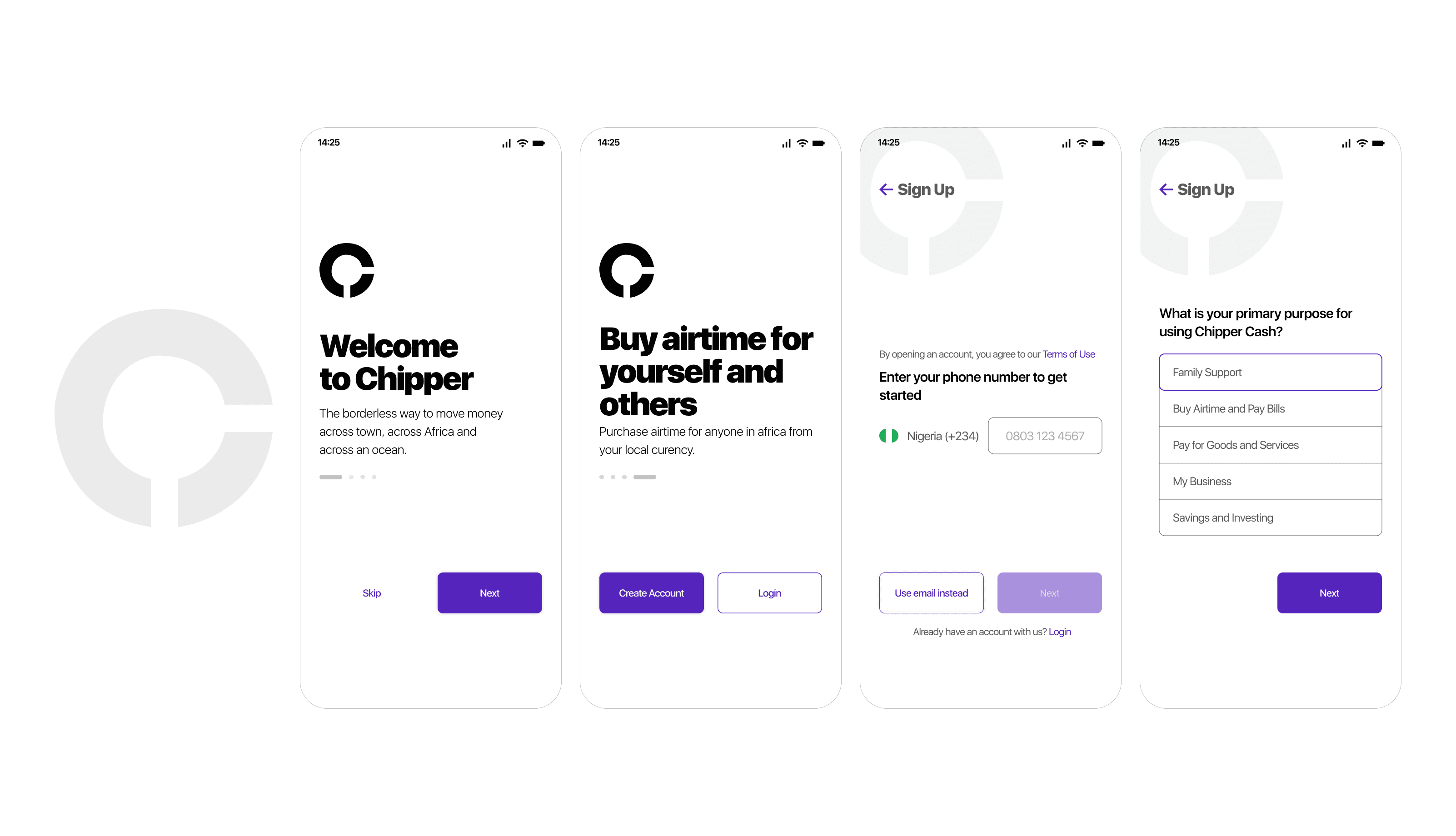 I redesigned the onboarding flow and UI for the Chipper Cash App. The goal of the project was to improve the overall experience for users, starting with the onboarding section of the application. I was motivated to do this, after I first signed up on the app and noticed the UI wasn’t quite appealing, and the overall onboarding experience didn’t feel well thought-out. So I tweaked the flow a bit and came up with an improved design (images within the rounded rectangles) below: