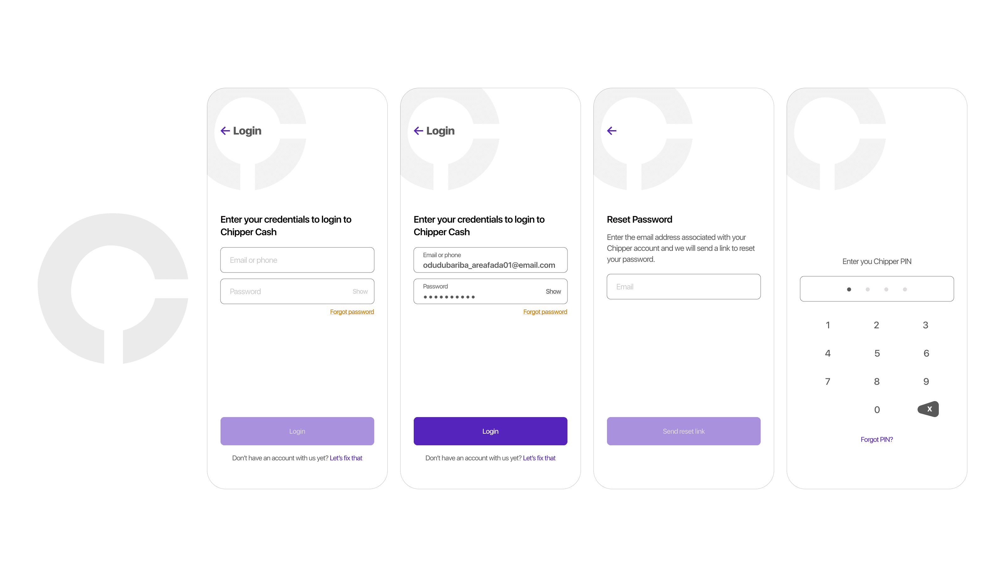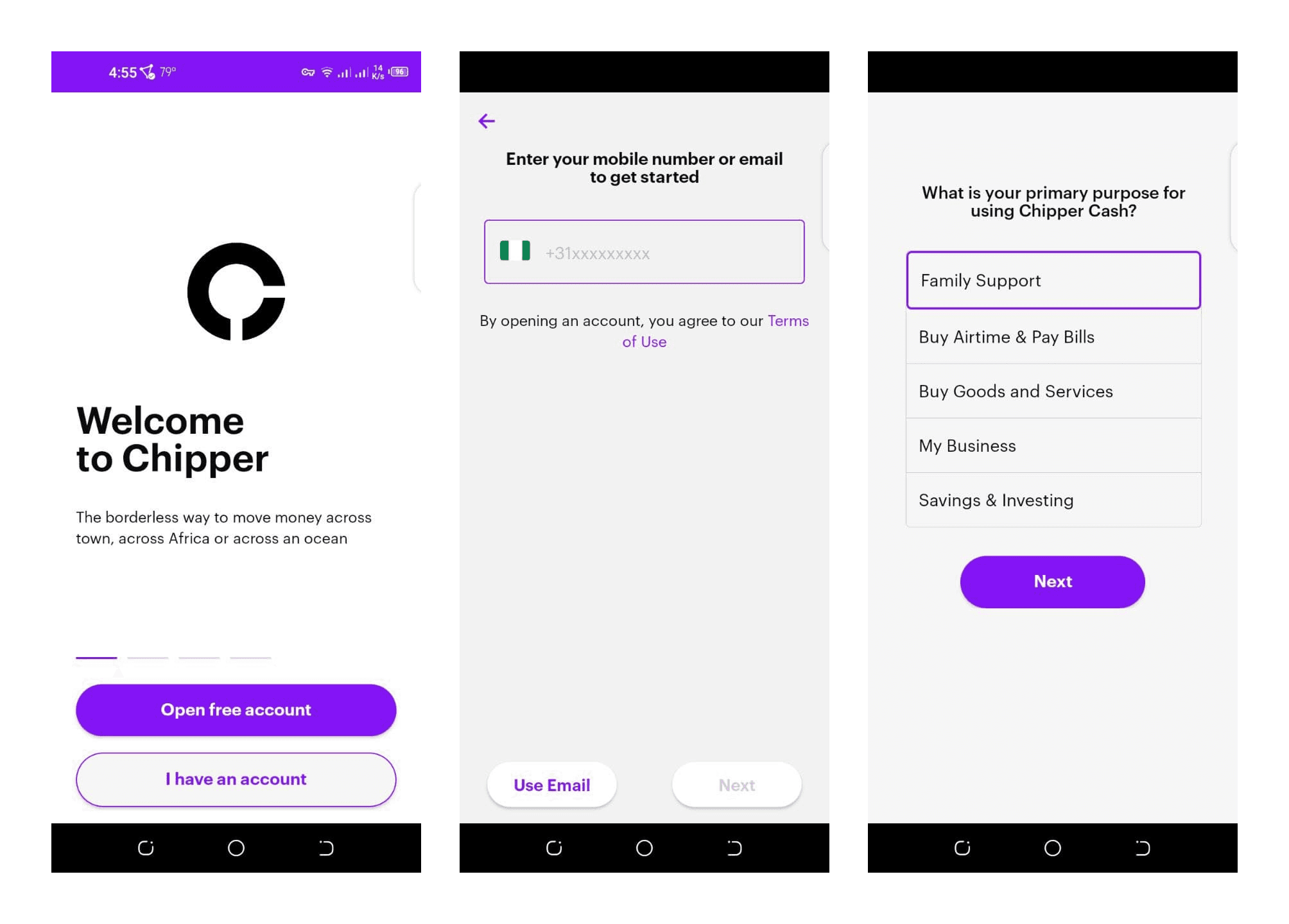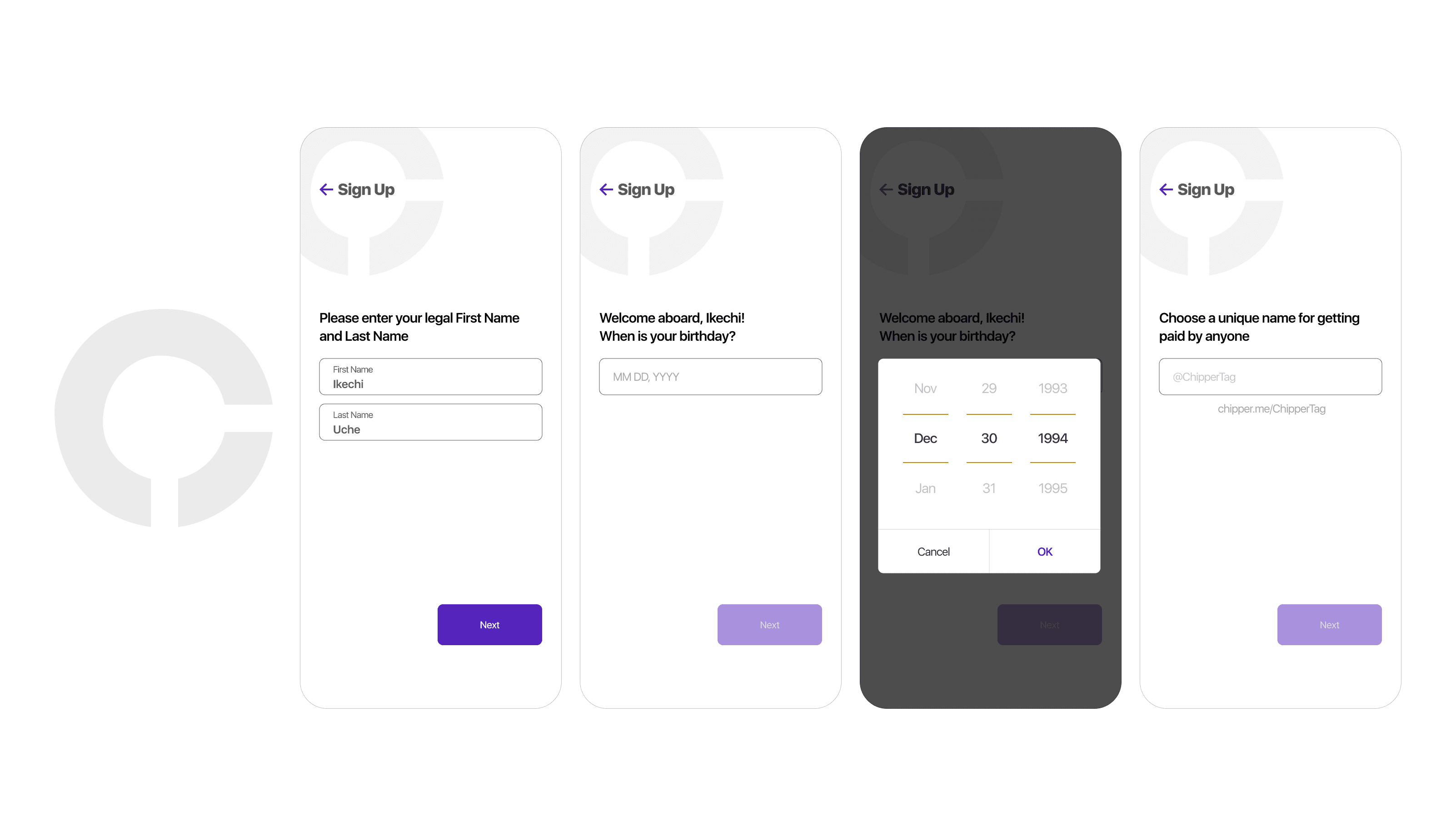 I redesigned the onboarding flow and UI for the Chipper Cash App. The goal of the project was to improve the overall experience for users, starting with the onboarding section of the application. I was motivated to do this, after I first signed up on the app and noticed the UI wasn’t quite appealing, and the overall onboarding experience didn’t feel well thought-out. So I tweaked the flow a bit and came up with an improved design (images within the rounded rectangles) below: